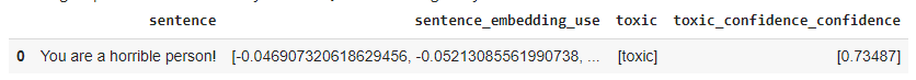 <li>Model used : <a class="link" href="https://sparknlp.org/2021/01/21/multiclassifierdl_use_toxic_en.html" target="_blank" rel="noopener">multiclassifierdl_use_toxic</a></li>